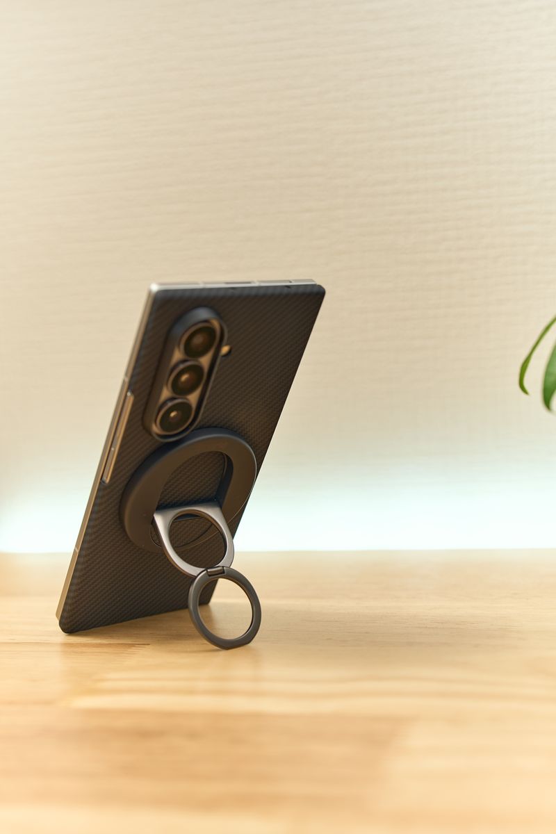 PITAKAケースを装着したFold7なら、iPhone向けに揃えたMagSafeアクセサリーがそのままくっつきます。カチャっと吸い付く感覚もiPhoneと遜色なく、GalaxyでもMagSafeエコシステムに乗れるのは想像以上に快適です。