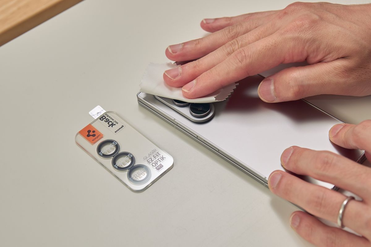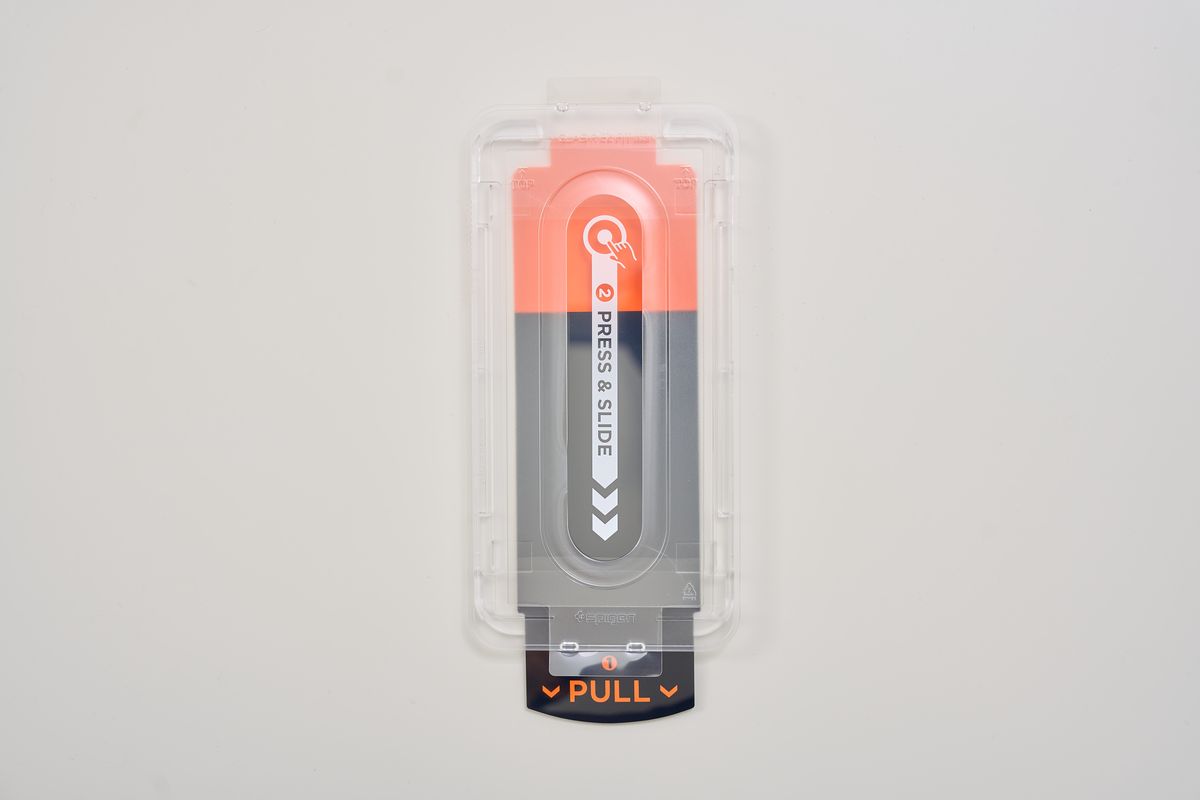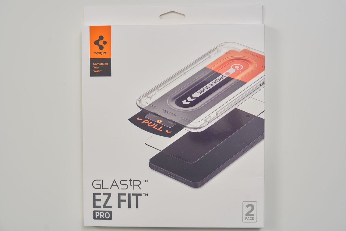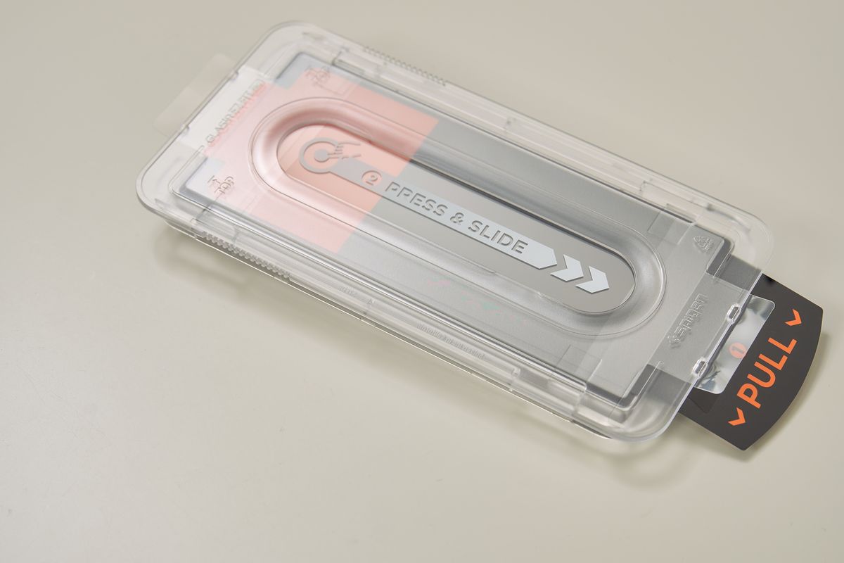 このフィルムの最大の特徴は、SpigenがGalaxy・iPhone問わず展開しているEZ Fitトレイ式の貼付方式です。やり方は通常のフィルム同様、まずクリーニングキットで画面を清掃し、付属のテープで埃を除去します。その後、フィルムがセットされた専用カバーをかぶせ、リリースフィルムをただ引っ張るだけ。これで貼付完了です。