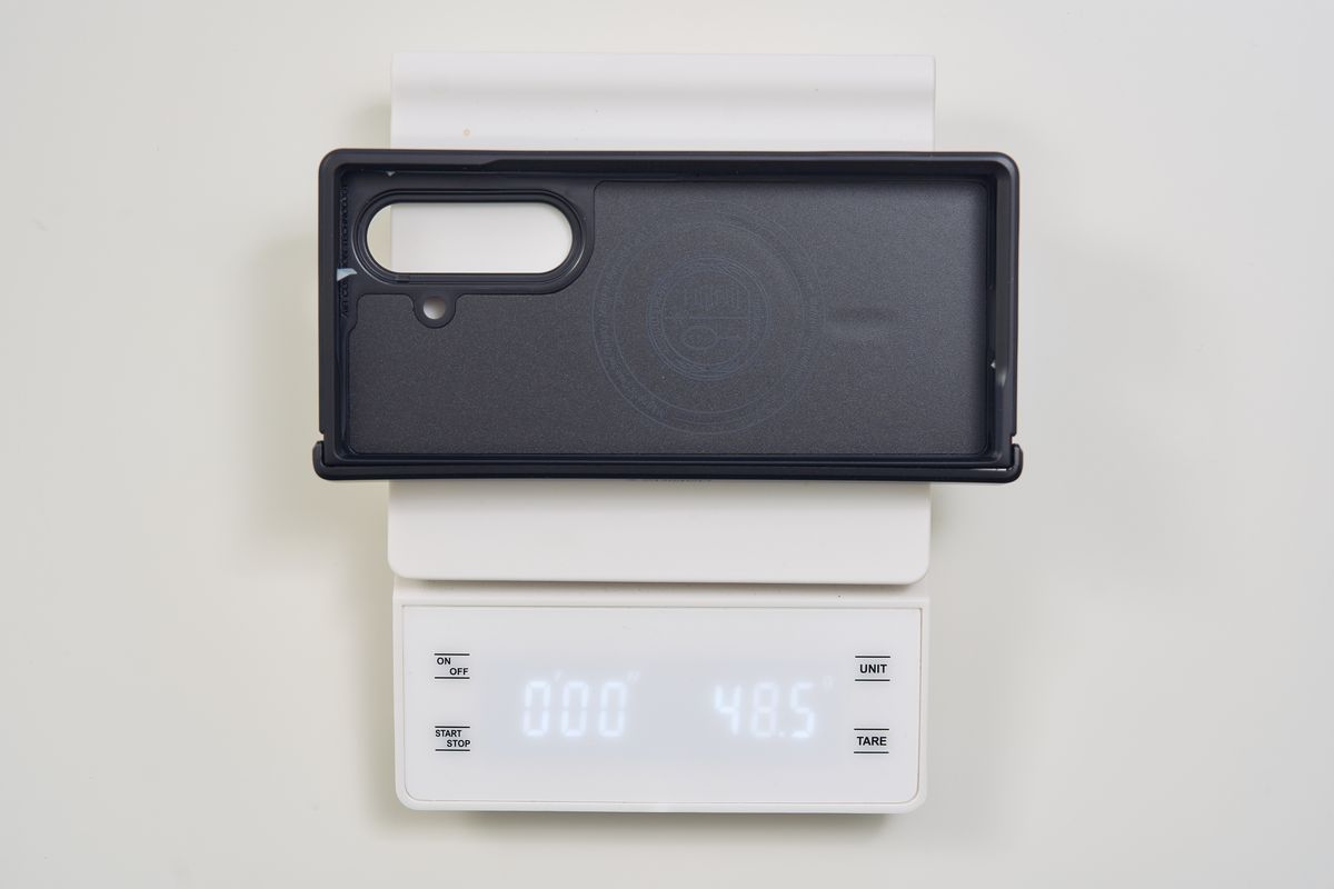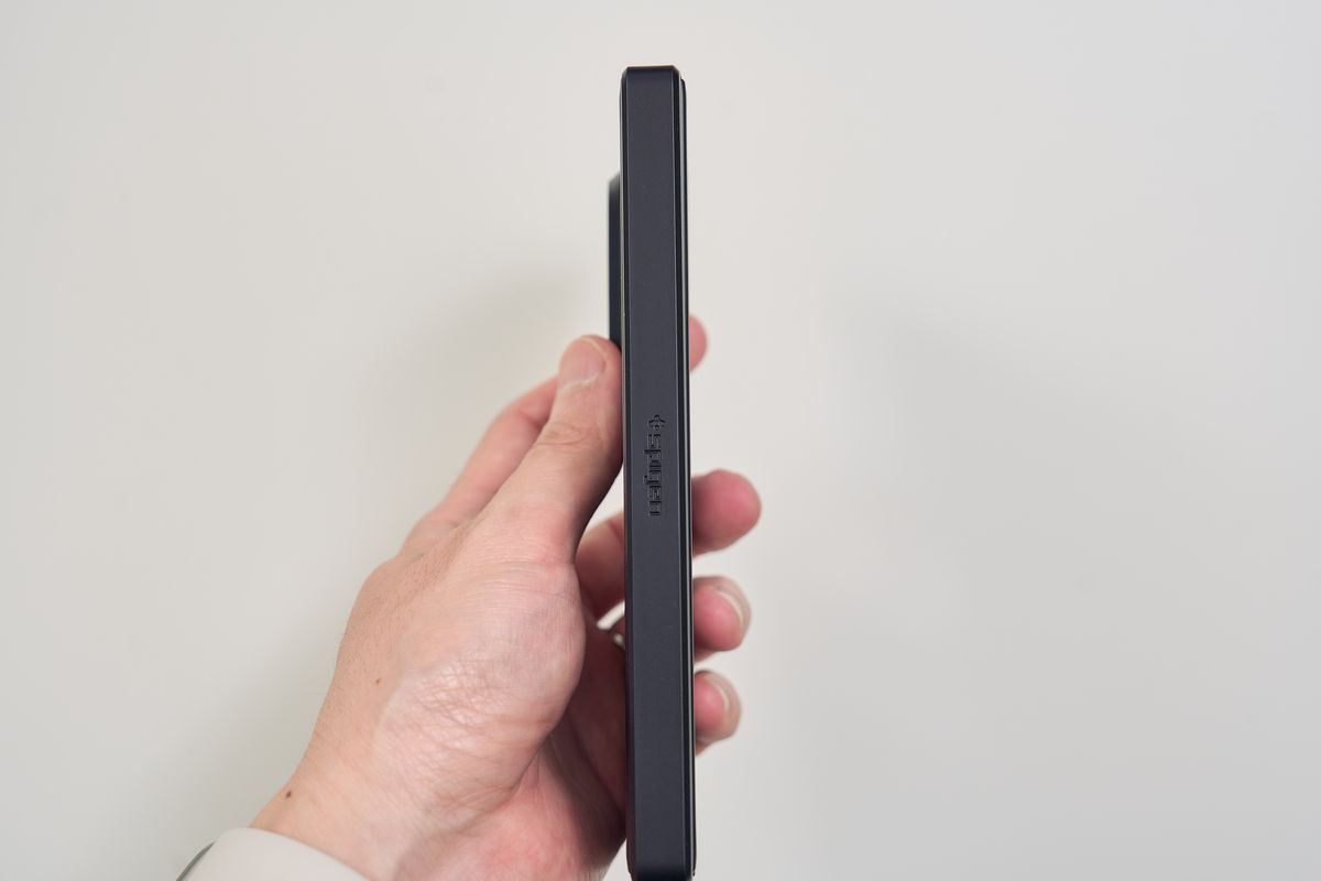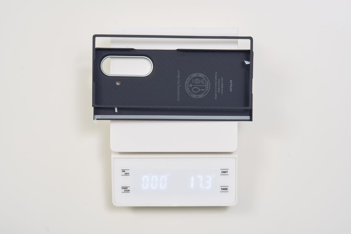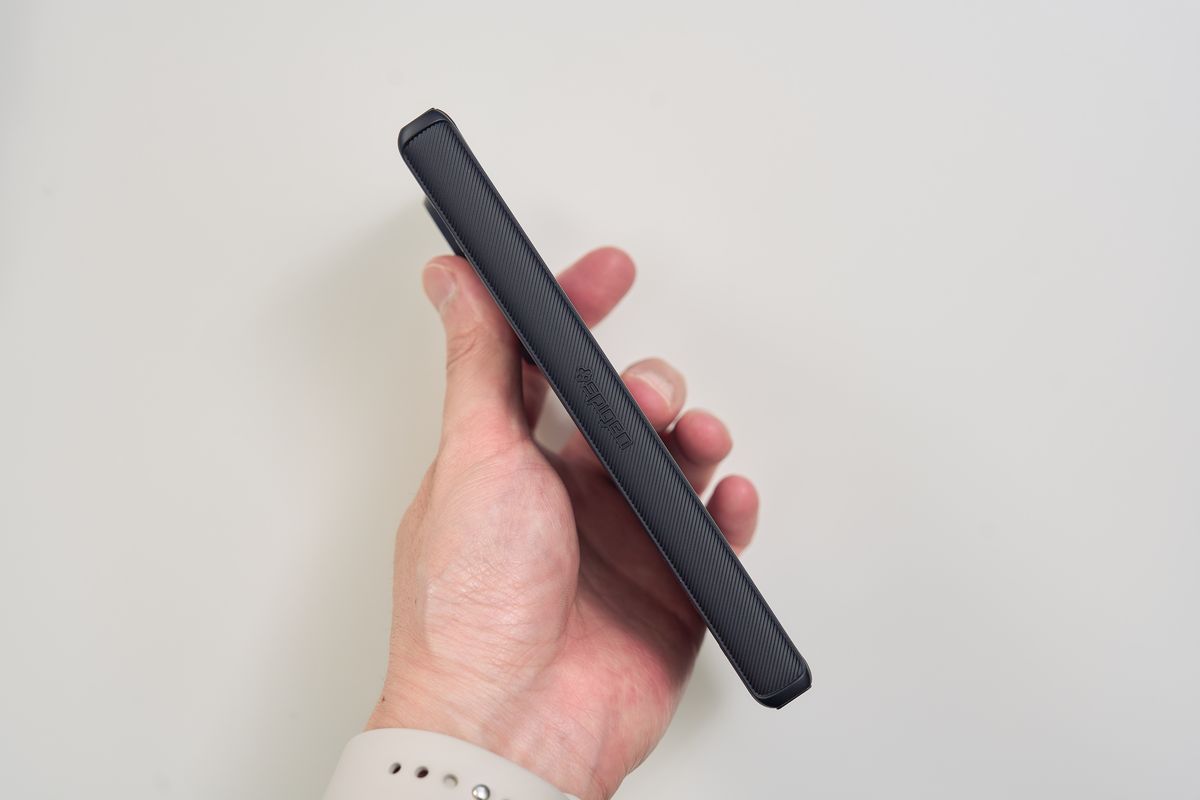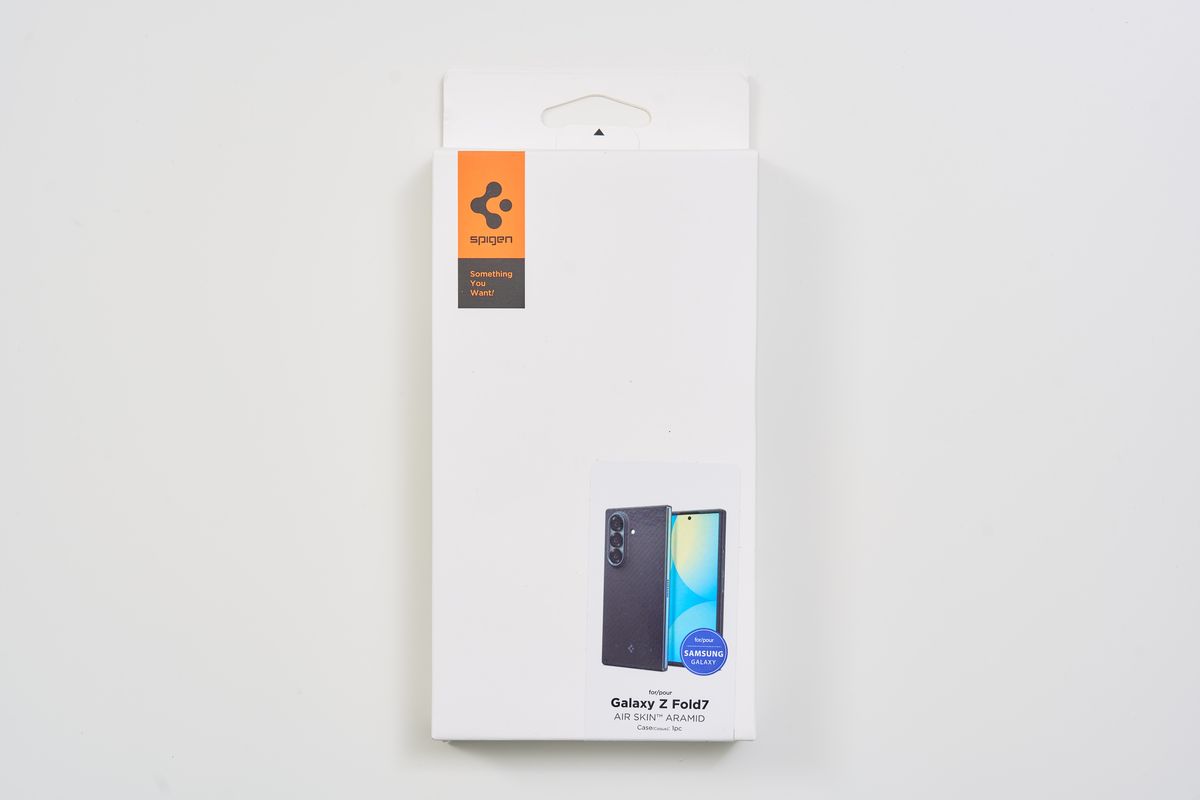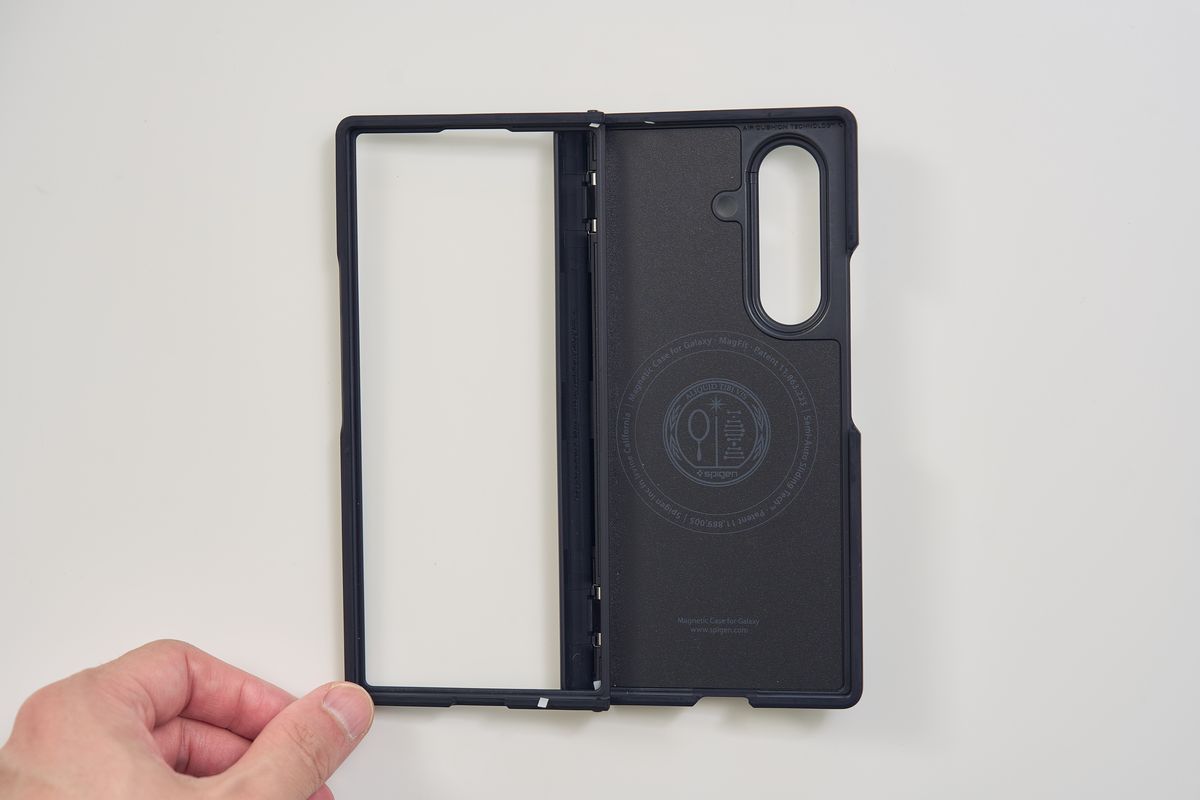 触ってみるとアラミド繊維特有のサラッとした手触りで、安っぽさは皆無。背面は中央のSpigenロゴ1つというシンプルなデザインで、Galaxy Z Fold7本体のデザイン性をほとんど損ないません。個人的には、デザイン重視で選ぶなら一番好きなケースです。