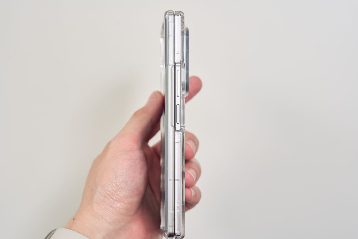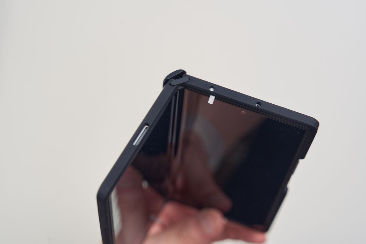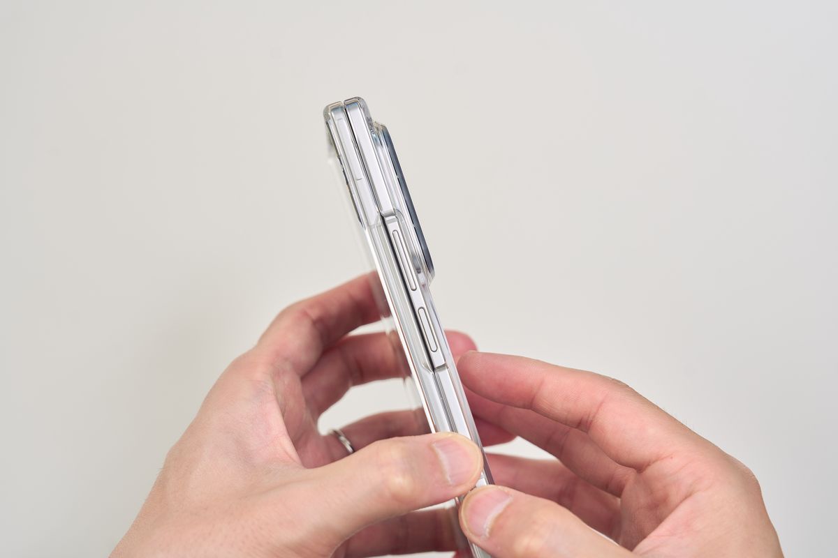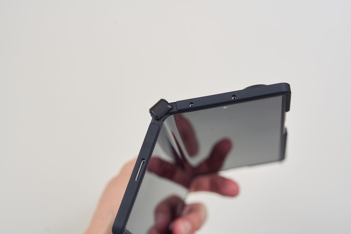 レンズカバーも装備されており、ボタン部分は開放されているものの、保護力としてはかなり高い部類に入ります。装着すると当然サイズ感は一回り大きくなる印象を受けますが、Z Fold7自体が薄いので「分厚すぎて持ちにくい」というほどではありません。