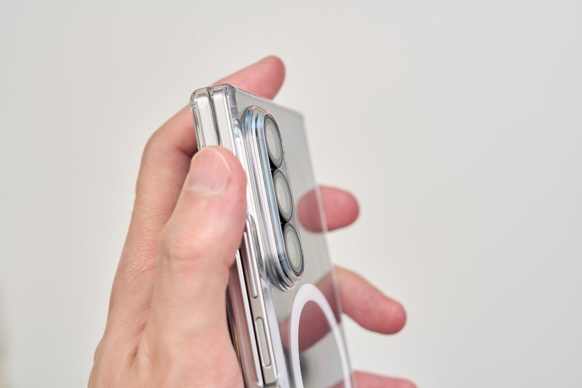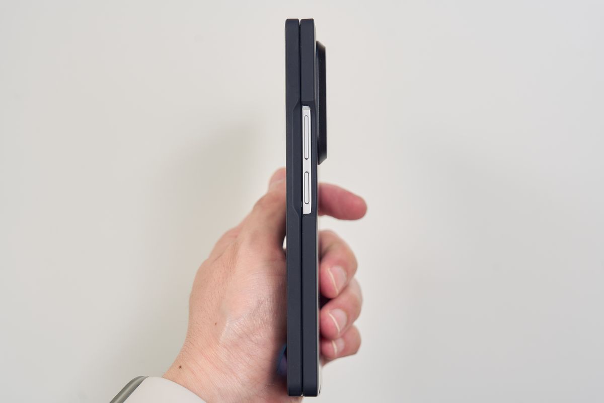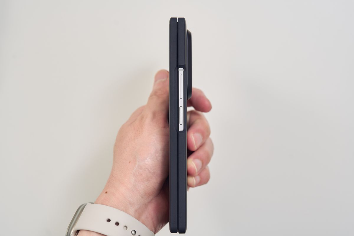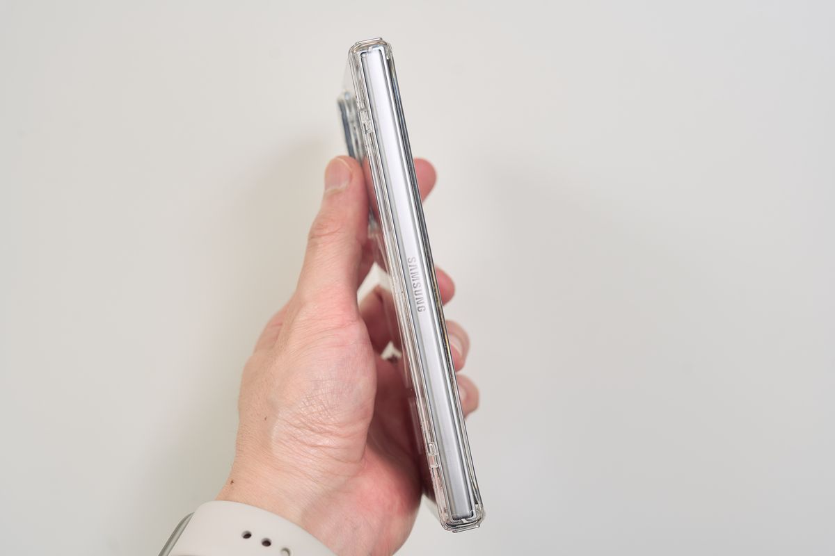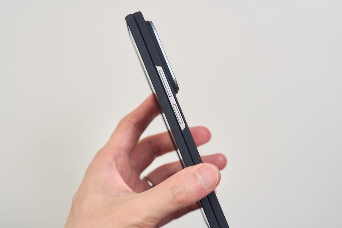 レンズカバーも装備されており、ボタン部分は開放されているものの、保護力としてはかなり高い部類に入ります。装着すると当然サイズ感は一回り大きくなる印象を受けますが、Z Fold7自体が薄いので「分厚すぎて持ちにくい」というほどではありません。