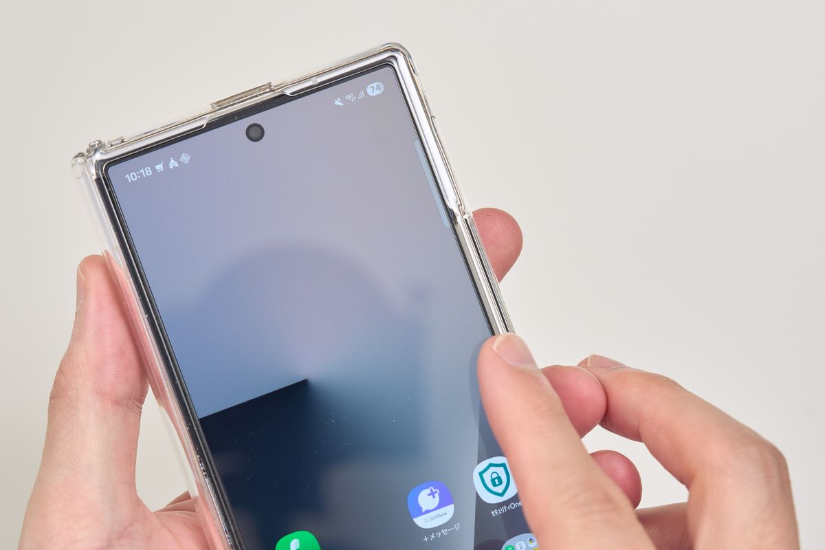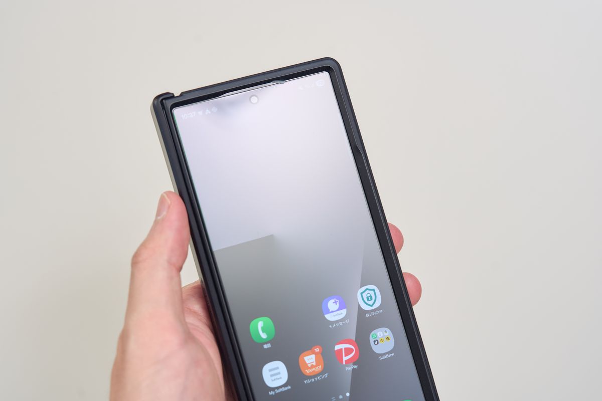 これはウルトラハイブリッドにも共通しますが、保護のためにケースのカバー部分がディスプレイより少し出ている構造のため、戻る操作や端ジェスチャーが少しやりづらくなることがあります。慣れの問題ではありますが、最初は気になるかもしれません。