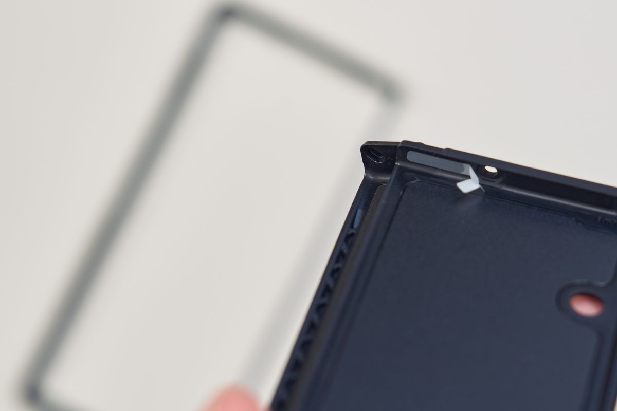 装着方法は同じくテープを使った固定式で、簡単に取り外しはできない仕様です。ヒンジ保護がない分、サイド部分は削られているため、持った時の印象としては片側だけ横が出っ張っているような感覚が少しあります。厚みもウルトラハイブリッドに比べると薄く、装着感はかなり軽いです。